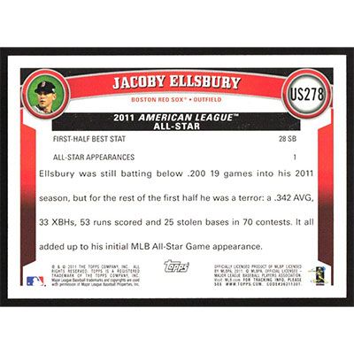 This is a 2011 Topps Update Jacoby Ellsbury All-Star baseball card. The card is #US278 and pictures show condition.