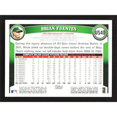 This is a 2011 Topps Update Brian Fuentes baseball card. The card is #US40 and pictures show condition.