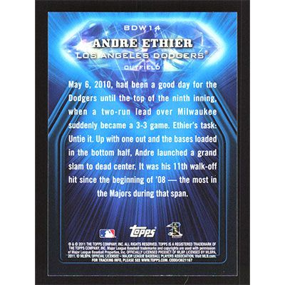 This is a 2011 Topps Wal-Mart Blue Diamond Andre Ethier baseball card. The card is #BDW14 and pictures show condition.