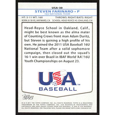 This is a 2011 USA Baseball Steven Farinaro baseball card. The card is #USA-30 and pictures show condition.