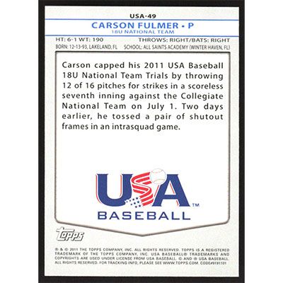 This is a 2011 USA Baseball Carson Fulmer baseball card. The card is #USA-49 and pictures show condition.