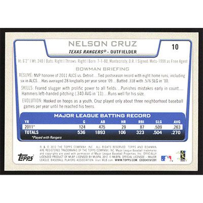 This is a 2012 Bowman Nelson Cruz baseball card. The card is #10 and pictures show condition.