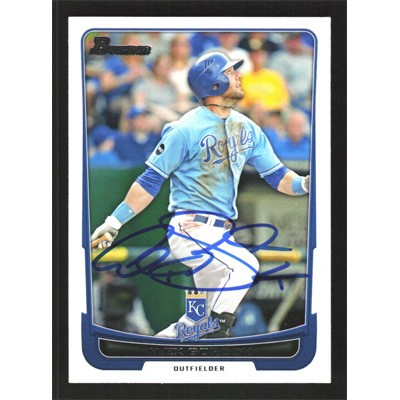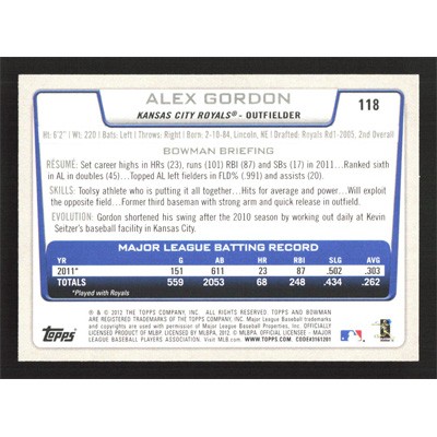 This is a 2012 Bowman Alex Gordon autographed baseball card. This card has been signed, in blue, by Alex Gordon, and is guaranteed authentic by Ballcardz.com. The card is #118 and pictures show condition.