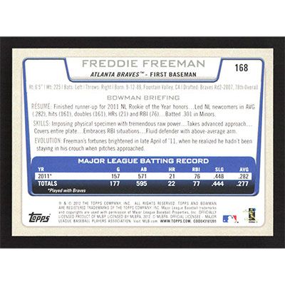 This is a 2012 Bowman Freddie Freeman baseball card. The card is #168 and pictures show condition.