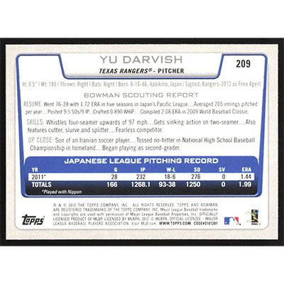 This is a 2012 Bowman Yu Darvish baseball card. The card is #209 and pictures show condition.