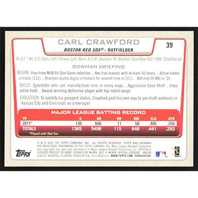 This is a 2012 Bowman Carl Crawford baseball card. The card is #39 and pictures show condition.
