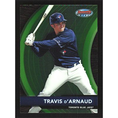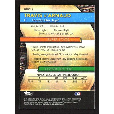 This is a 2012 Bowman Bowman's Best Prospects Travis d'Arnaud baseball card. The card is #BBP11 and pictures show condition.