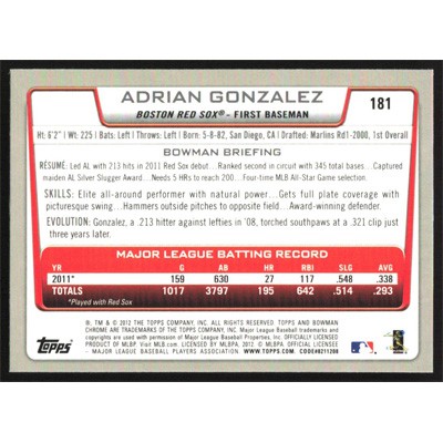 This is a 2012 Bowman Chrome Adrian Gonzalez baseball card. The card is #181 and pictures show condition.