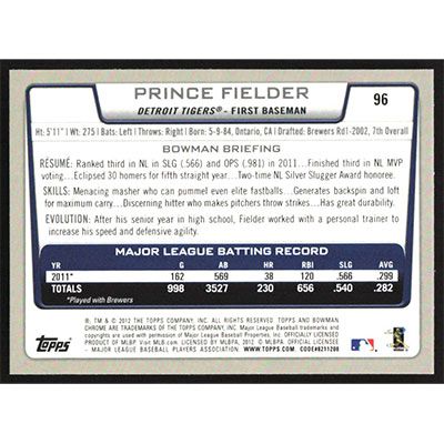 This is a 2012 Bowman Chrome Prince Fielder baseball card. The card is #96 and pictures show condition.