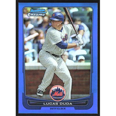 This is a 2012 Bowman Chrome Blue Refractors Lucas Duda baseball card. The card is #141 and pictures show condition. This card is limited; #'d 131/250.