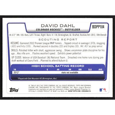 This is a 2012 Bowman Chrome Draft Draft Picks David Dahl baseball card. The card is #BDPP104 and pictures show condition.