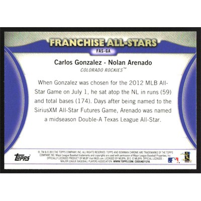 This is a 2012 Bowman Chrome Franchise All-Stars Carlos Gonzalez and Nolan Arenado baseball card. The card is #FAS-GA and pictures show condition. Team(s): Colorado Rockies