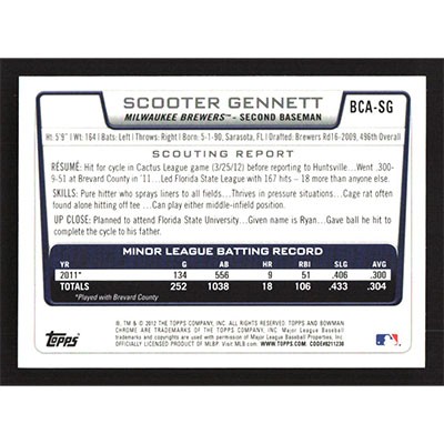 This is a 2012 Bowman Chrome Prospects Autographs Scooter Gennett autographed baseball card. This card has been signed, in blue, by Scooter Gennett, and is certified authentic by Topps. The card is #BCA-SG and pictures show condition.