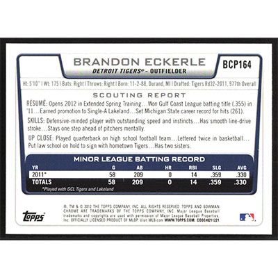 This is a 2012 Bowman Chrome Prospects Brandon Eckerle baseball card. The card is #BCP164 and pictures show condition.