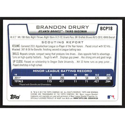 This is a 2012 Bowman Chrome Prospects Brandon Drury baseball card. The card is #BCP18 and pictures show condition.