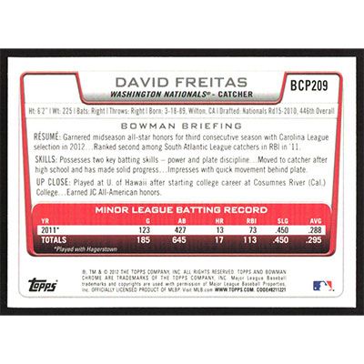 This is a 2012 Bowman Chrome Prospects David Freitas baseball card. The card is #BCP209 and pictures show condition.