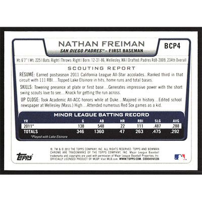 This is a 2012 Bowman Chrome Prospects Nathan Freiman baseball card. The card is #BCP4 and pictures show condition.