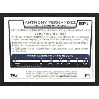 This is a 2012 Bowman Chrome Prospects Anthony Fernandez baseball card. The card is #BCP46 and pictures show condition.