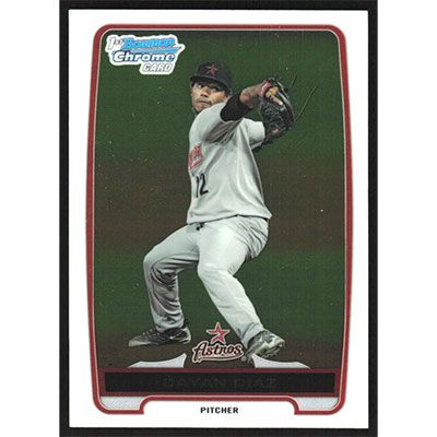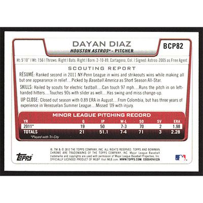 This is a 2012 Bowman Chrome Prospects Dayan Diaz baseball card. The card is #BCP82 and pictures show condition.