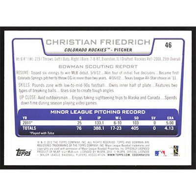 This is a 2012 Bowman Draft Christian Friedrich baseball card. The card is #46 and pictures show condition.