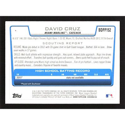This is a 2012 Bowman Draft Draft Picks David Cruz baseball card. The card is #BDPP152 and pictures show condition.