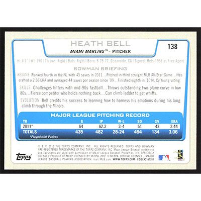 This is a 2012 Bowman Gold Heath Bell baseball card. The card is #138 and pictures show condition.