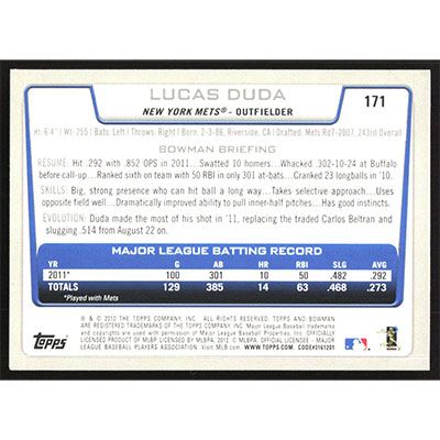 This is a 2012 Bowman Gold Lucas Duda baseball card. The card is #171 and pictures show condition.
