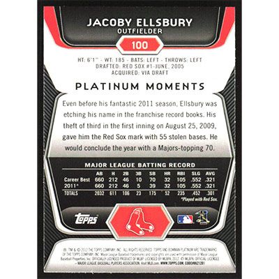 This is a 2012 Bowman Platinum Jacoby Ellsbury baseball card. The card is #100 and pictures show condition.
