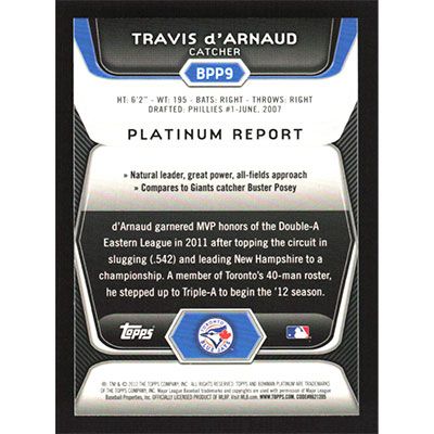 This is a 2012 Bowman Platinum Prospects Purple Refractors Travis d'Arnaud baseball card. The card is #BPP9 and pictures show condition. Team(s): Toronto Blue Jays