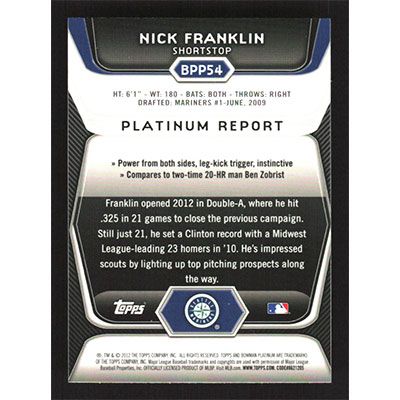 This is a 2012 Bowman Platinum Prospects Refractors Nick Franklin baseball card. The card is #BPP54 and pictures show condition. Team(s): Seattle Mariners