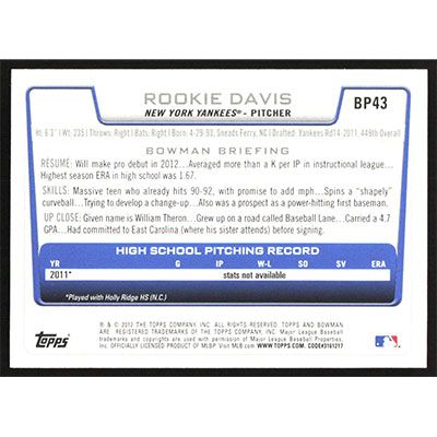 This is a 2012 Bowman Prospects Rookie Davis baseball card. The card is #BP43 and pictures show condition.