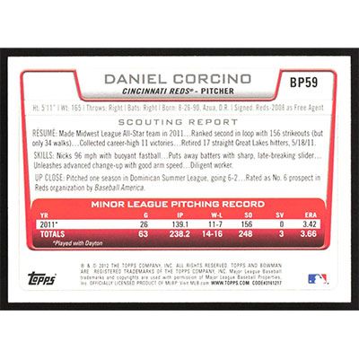 This is a 2012 Bowman Prospects Daniel Corcino baseball card. The card is #BP59 and pictures show condition.