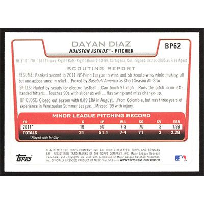 This is a 2012 Bowman Prospects Dayan Diaz baseball card. The card is #BP62 and pictures show condition.