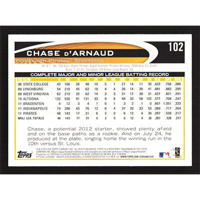 This is a 2012 Topps Chase d'Arnaud baseball card. The card is #102 and pictures show condition.