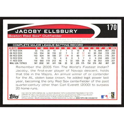 This is a 2012 Topps Jacoby Ellsbury baseball card. The card is #170 and pictures show condition.