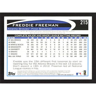This is a 2012 Topps Freddie Freeman baseball card. The card is #215 and pictures show condition.