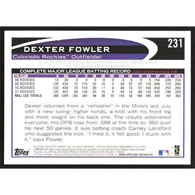 This is a 2012 Topps Dexter Fowler baseball card. The card is #231 and pictures show condition.