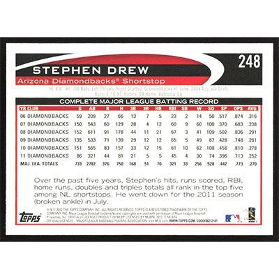 This is a 2012 Topps Stephen Drew baseball card. The card is #248 and pictures show condition.