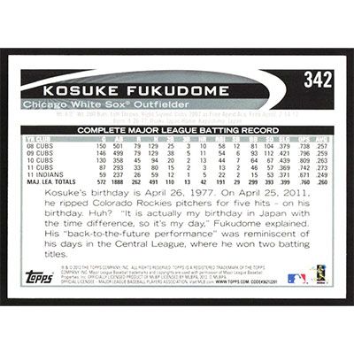 This is a 2012 Topps Kosuke Fukudome baseball card. The card is #342 and pictures show condition.