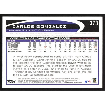 This is a 2012 Topps Carlos Gonzalez baseball card. The card is #373 and pictures show condition.