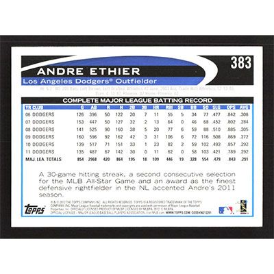 This is a 2012 Topps Andre Ethier baseball card. The card is #383 and pictures show condition.