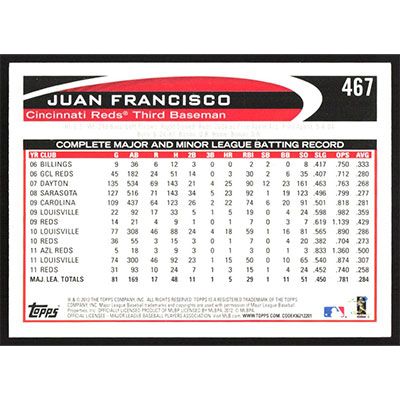 This is a 2012 Topps Juan Francisco autographed baseball card. This card has been signed, in black, by Juan Francisco, and is guaranteed authentic by Ballcardz.com. The card is #467 and pictures show condition.