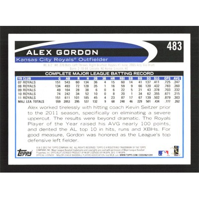 This is a 2012 Topps Alex Gordon baseball card. The card is #483 and pictures show condition.