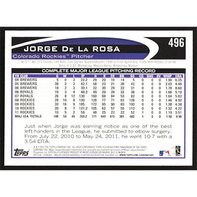 This is a 2012 Topps Jorge De La Rosa baseball card. The card is #496 and pictures show condition.
