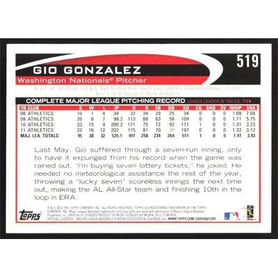This is a 2012 Topps Gio Gonzalez baseball card. The card is #519 and pictures show condition.