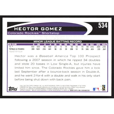 This is a 2012 Topps Hector Gomez baseball card. The card is #534 and pictures show condition.