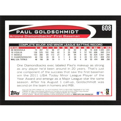 This is a 2012 Topps Paul Goldschmidt baseball card. The card is #608 and pictures show condition.