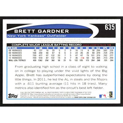 This is a 2012 Topps Brett Gardner baseball card. The card is #635 and pictures show condition.