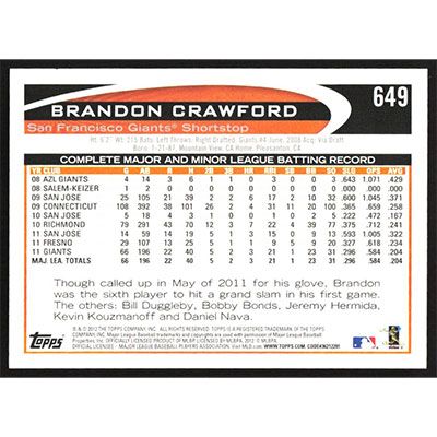 This is a 2012 Topps Brandon Crawford baseball card. The card is #649 and pictures show condition.