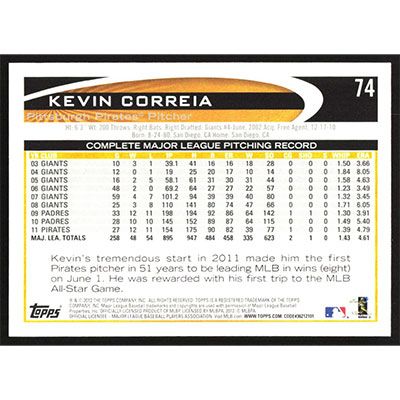 This is a 2012 Topps Kevin Correia baseball card. The card is #74 and pictures show condition.